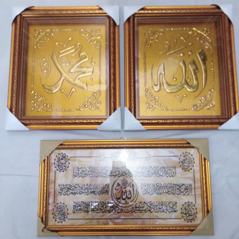 Kaligrafi allah Muhammad ayat kursiDetail ukuran : 30cm x 35cm allah :30cm x 35cm muhamad : 25cm x 45cm ayat kursiSatu paket 3 buahKaligrafi tahan lama awet Terbuat dari Kuningan dan poster dengan bingkai bingkai pibber dan lapisan kaca 0,3ml menjadikan kaligrafi ini indah, cantik menarik