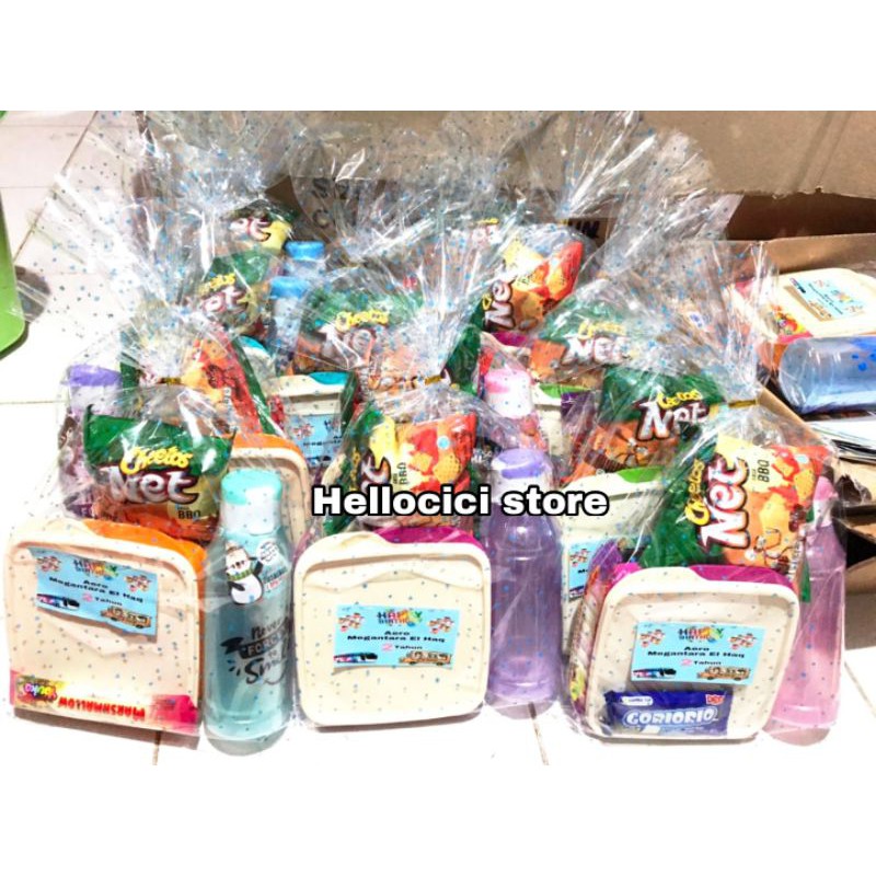 parcel bingkisan snack kemasan ultah 1 pcs lunch box kyoto 1 pcs botol takuma 500 ml 1 pcs chiki chetos 1 pcs yupi marsmellow1 pcs chocho chips / pillow 1 pcs gorio" 1 pcs mieshoer 1 pcs momogi 1 pcs plastik kemasan 1 pcs pita kawat dan card n