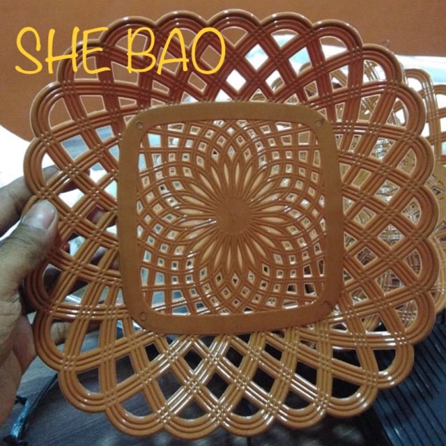 Harga : 1pcsBahan : Biji Plastik Pilihan PPWarna : Cokelat dan Silver Diameter : 25 cm -+Kemasan :1 Lusin isi 12 pcsPiring plastik model anyaman. Bahan tebal, ringan serta food grade.Sangat cocok untuk usaha rumah makan, tinggal di lapisi kertas makanan dan tidak perlu mencuci piring