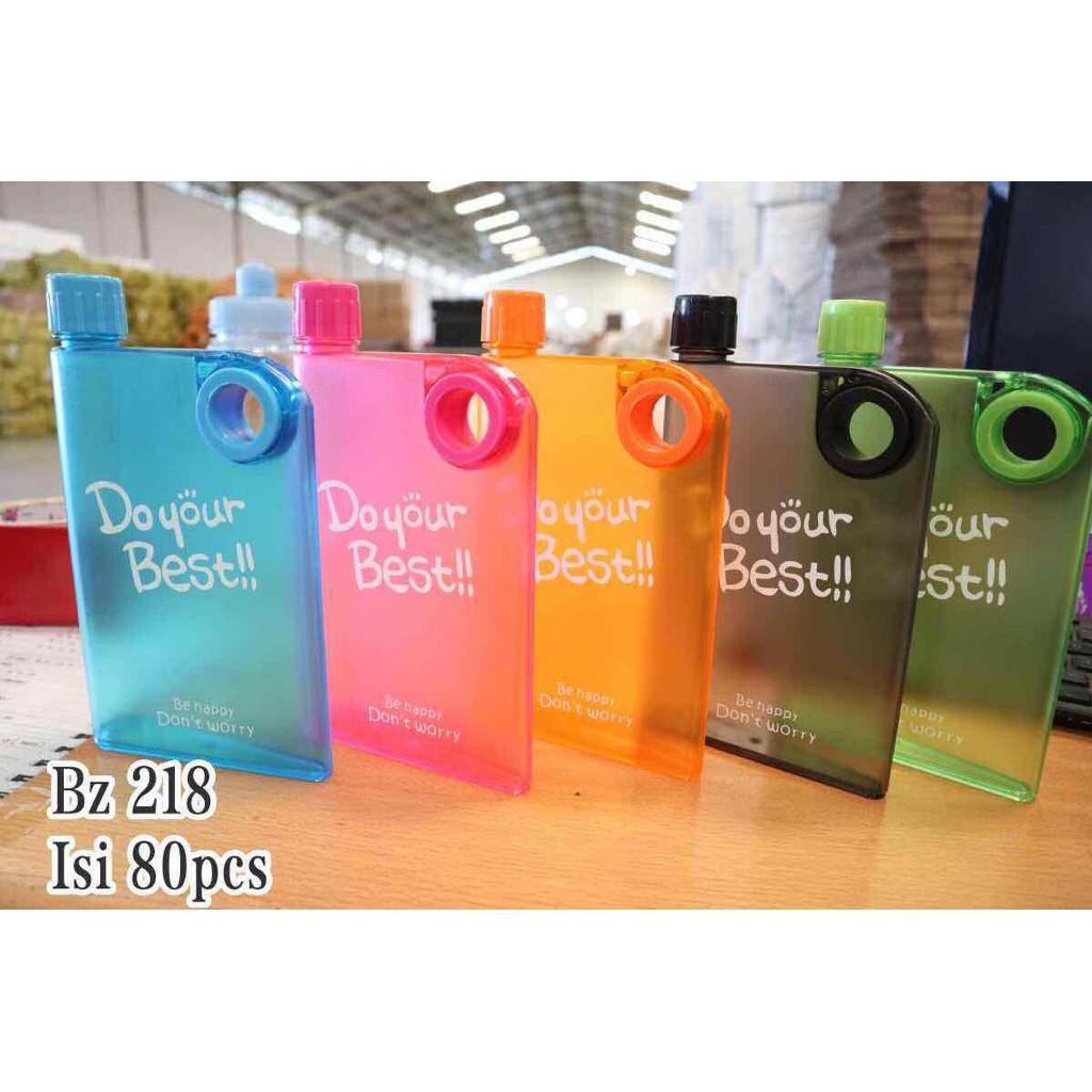 Deskripsi Ready Memo Bottle Do Your Best Botol Minum MemoBottle Transparan/BotolBotol minum Do Your Best ini memiliki bentuk kotak rata sehingga mudah dimasukkan kedalam tas. Selain itu botol minum ini juga memiliki sebuah lubang kecil yang dapat Anda gunakan untuk menaruh tali sehingga dapat digantung dibelakang tas Anda. Botol ini dapat menampung 380ml air. Botol minum ini menggunakan bahan plastik berkualitas dan juga aman tidak mengandung zat kimia berbah