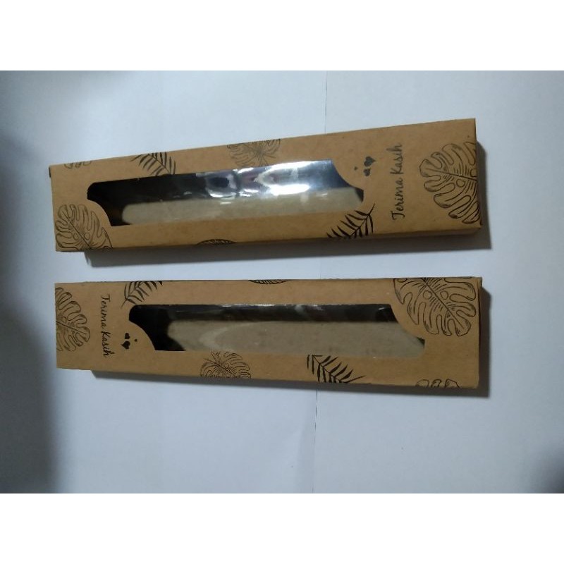 Box buat Kemas Sendok garpu sumpit go green.bahan Kardus konsep Rustic.Bagian transparan menggunakan mika.Panjang 18 ,5 CmLebar 4 Cmtinggi Samping 2 cm.bisa Juga buat kemas Souvenir lain misal buat sendok dan garpu stenlesbuat Sisir sikat dll.Pembelian min. 100 pcs. penambahan selanjutnya kelipatan 50 misal 150, 200, 250 , 30