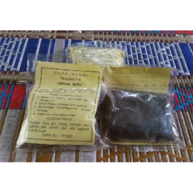 Ratus Dupa Wangi Temanten Tradisional Sekar Sari OriginalDupa wangi temanten sekar sari terbuat dari bahan-bahan tradisional pilihan yang bermutu tinggi dan terjamin kualitasnya.Khasiat:- Mengharumkan daerah kewanitaan- Mengharumkan- Mengharumkan dan mengeringkan rambut sehabis keramas- Membuat pakaian menjadi harum- Membuat ruangan segar dan harum secara alami- Mengharumkan ruangan pengantinCara penggunaan:- Buat bara api dari briket/arang ratus, letakkan diatas tungku/anglo, taburkan ratus temanten secukupkan diatas bara sehingga berasap, arahkan asap pada daerah kewanitaan, badan, rambut, dan pakaian, atau- Ambil ratus temanten secukupnya, campur dengan sedikit air, oleskan pada daerah kewanitaan, rambut, badan, dan pakaianManjakan Pasangan Anda dengan keharuman yang menyegarkan. (Untuk +-3x pakai).#ratus #temanten #ratussekarsari #ratustemanten #duparatus #duparatustemanten #duparatustemantensekarsari #duparatusseka