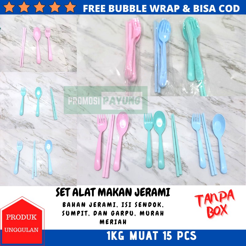 Set Alat Makan Jerami ini terbuat dari Plastik berkualitas (Jerami Gandum), bahannya yang kuat dan juga dilengkapi dengan 3 warna yang lembut.Warna-warnanya:- Pink muda- Biru muda- Hijau muda- cream- unguUkurannya sangat cocok dibawa buat bekal sekolah, tempat kerja maupun travelling.1KG BISA ISI 15 PCSCocok sebagai pelengkap hadiah atau souvenir.Yang didapat :*sendok, garpu, dan sumpit*Bahan Jerami gandum*Panjang kurang lebih 19-20cm*Packing plastik*Produk sesuai foto, tidak ada kotaknya.Silahkan dituliskan warnanya saat melakukan checkout, jika tidak maka akan dikirim warna random.#Happy shoppingKet:- Tidak disarankan dipakai untuk suhu yang sangat