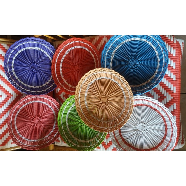 Piring yang terbuat dari rotan sintetis dengan diameter 25cm. Sangat mempermudah penyajian jika sedang mengadakan acara, hanya dengan melapisi dengan kertas untuk nasi sehingga piring tetap bersih dan tidak perlu di cuci. Tahan air dan tidak mudah